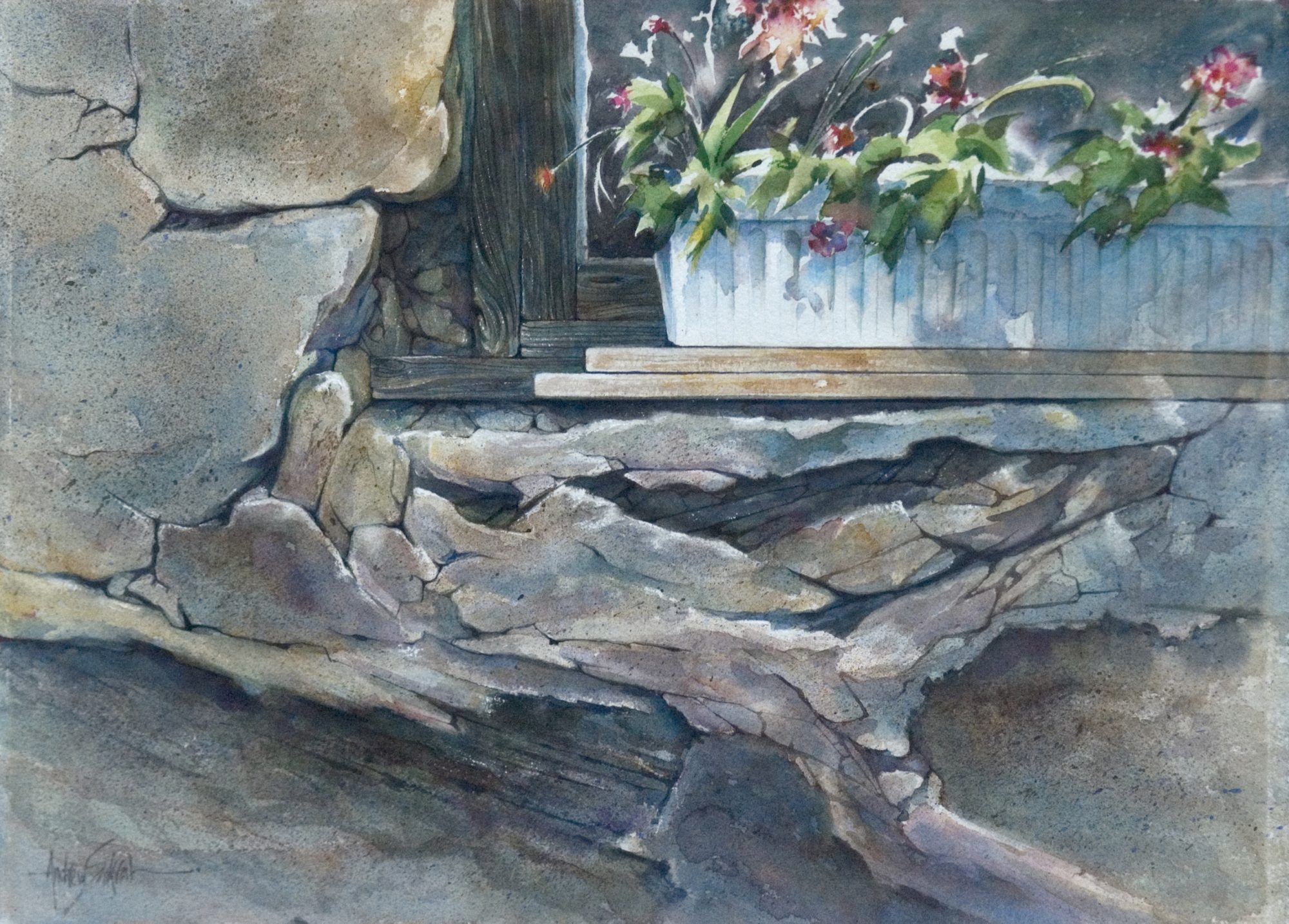 A study done of a delightful flower box seen on the windowsill of a barn, from one of the day painting sessions with the artists of the Arts & Letters Club of Toronto. Nice exploration of rock texture and wood grain, lots of dry-brush…